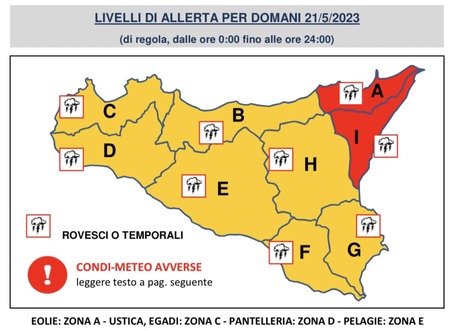 Il Dipartimento Regionale della Protezione Civile della Presidenza della Regione Siciliana ha diramato l’avviso di condizioni meteo avverse che dalle ore 16,00 del 20 maggio fino alle ore 24:00 del 21 maggio 2023 si prevedono precipitazioni a carattere di rovescio o temporale e forti venti, Autostrade Siciliane raccomanda di moderare la velocità su tutta la rete autostrade.